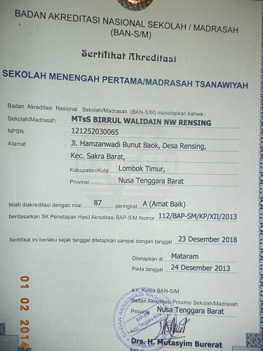 Pelaksanaan akreditasi Madrasah Tsanawiyah Birrul Walidain NW Rensing Kec. Sakra Barat Kab. Lombok Timur telah dilaksanakan pada tanggal 2-3 Desember 2013 lalu dimana akreditasi madrasah untuk pertama kali telah dilakukan pada tahun 2007 lalu namun berahir pada tahun 2011 lalu. Ada dua orang assesor Badan Akreditasi Provinsi (BAP) Sekolah/Madrasah Nusa Tenggara Barat yang melakukan Visitasi dan penilaian delapan standar pendidikan yaitu Drs. H.Suhardi,M.Pd dan Ibu Hj. Setiasih,M.Pd dan dari hasil visitasi dan penilaian tersebut sesuai dengan Surat Keputusan Hasil Akreditasi BAP S/M nomor 112/BAP-SM/KP/XII/2013 bahwa MTs Birrul Walidain NW Rensing NPSN 50202747 dan NSS 121252030065 memperoleh nilai 87 PERINGKAT A (Amat Baik) dengan nilai masing-masing komponen Standar Isi nilai 87, Standar Proses nilai 85, Standar Kompetensi Lulusan nilai 86, Standar Pendidik dan Tenaga Kependidikan nilai 87, Standar Sarana dan Prasarana nilai 84 , Standar Pengelolaan nilai 90,Standar Pembiayaan nilai 98 dan Standar Penilaian Pendidikan nilai 84.
