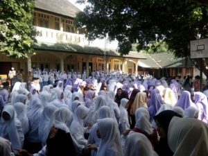 Terlihat para santriawan santriwati antusias mengikuti acara silaturrahmi dan bersalam-salaman dengan teman-temannya memenuhi lapangan bersama ponpes Birrul Walidain.